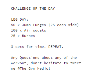 Any Questions about any of the workout, don’t hesitate to tweet me @The_Gym_Medic or Instgram @thegymmedic.